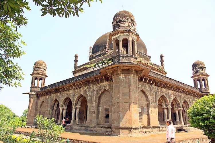 Situated on the banks of the Utavali River, the elevated tomb is 4 feet above the ground on a platform shaped like a rose petal. Built of stone and plastered with shell mortar, it features a melon-shaped dome, hence its name: Kharbuja Mahal/Kharboozi Gumbaz. The interior, too, features intricate carvings of plants and creepers, highlighting its architectural beauty.
