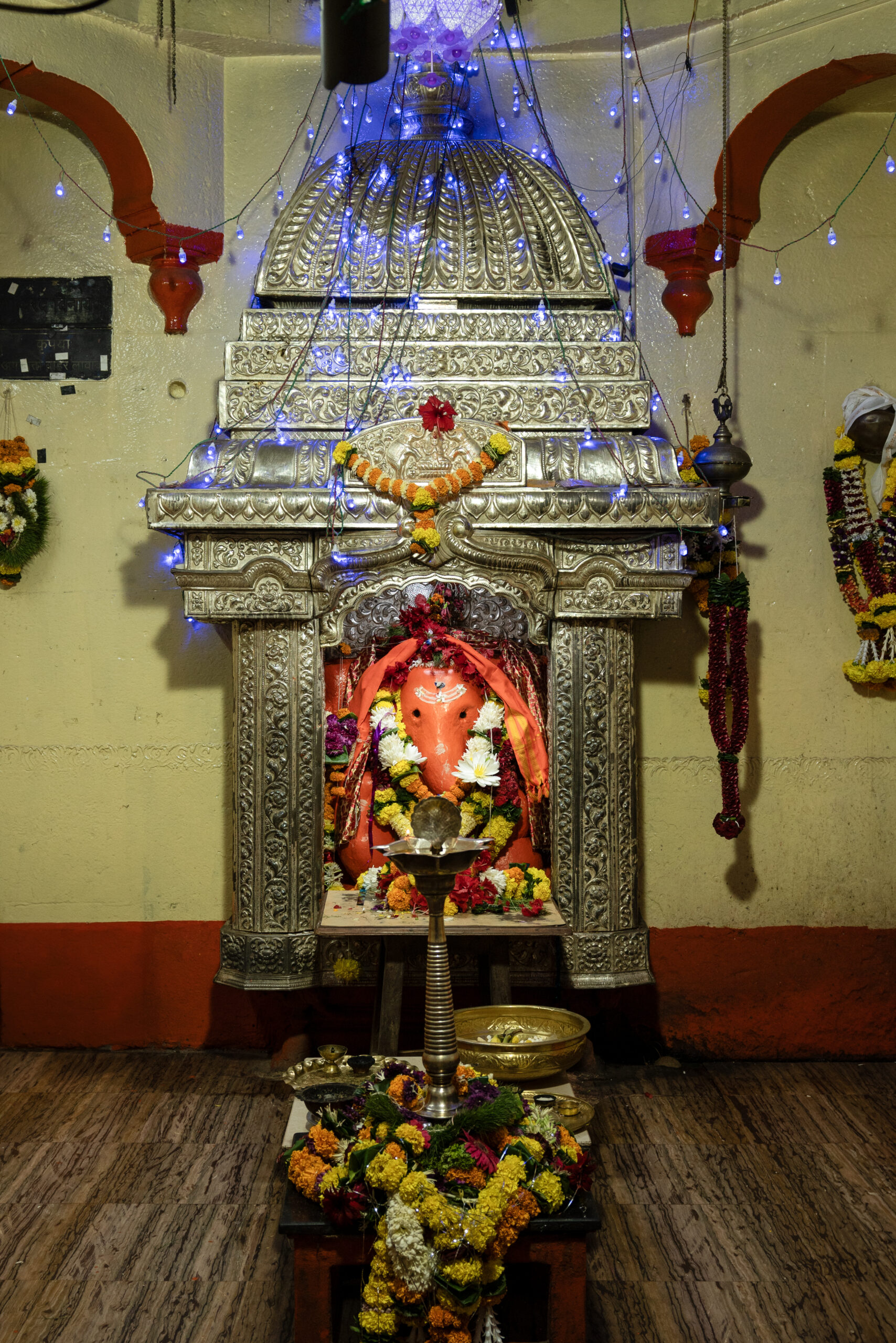 Morgaon’s Mayureshwar is one of only two idols in the entire Ashtavinayak circuit (the other being Siddhatek) where Ganesha’s trunk curves to the right.